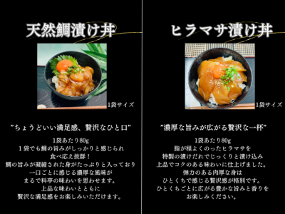 鯛とヒラマサの漬け丼2種(4食)に、香ばしく焼き上がる干物を贅沢に詰め合わせ。