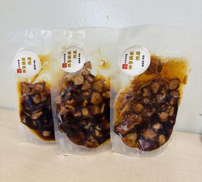 水揚げした蛸を船上で下処理し、そのまま加工場にて湯引き。冷ました蛸を切り分け当社自慢のタレに生姜と共に漬け込みました。